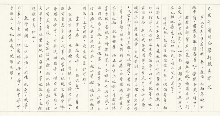 岁次己亥,节届清明;桥山巍丽,松柏翠凝。轩辕胄裔,肃戴虔敬,谨备尊礼,恭祭圣灵。辞曰: 赫赫吾祖,肇启八荒。绥服九牧,铸鼎安邦。创历定法,勋名焕彰。仁心弘恕,德耀天罡。千秋万代,享元祖之嘉惠;亿姓兆民,颂人文之兰芳。 悠悠天地,包容万物浩浩无际;泱泱华夏,相传薪火生生不息。岌岌近代,积困贫弱列强欺厉;卬卬新华,民族独立屈辱荡涤。四十年改革开放,家国富裕;新时代奋发图强,筑梦夙夕。防御风险,绸缪未雨;精准脱贫,史无前例;污染治理,坚定不移;攻坚克难,勇往直驱。减税降费,蓄经济繁荣之力;尊才重智,强自主创新之基。北斗嫦娥,探星月苍穹之秘;航母银鹰,扬卫国守土之旗。川藏铁路穿雪域,港珠澳桥架虹霓;各族儿女共呼吸,四海同胞唇齿依。云雷激荡,大变革百年未遇;自信在胸,九万里风鹏正举。核心掌舵,稳征帆驰风骋雨;上下同欲,众志成复兴可期。 堂堂三秦,壮志凌云,自强不息,月异日新。聚焦高质量,发展稳中有进;坚持兴产业,脱贫普惠乡亲。改革放管服,环境宜商营运;奔腾长安号,开放迭报佳音。倾力护生态,山河秀美奇俊;全面防风险,排忧除患解纷。埋头苦干,勇担重任砥砺奋进;牢记使命,追赶超越不忘初心。 乾坤朗朗,沮水汤汤。洪绪永念,盛举同襄。祈吾祖,助寰球同舟共济,佑中华万古恒昌。大礼告成,伏惟尚飨! |
