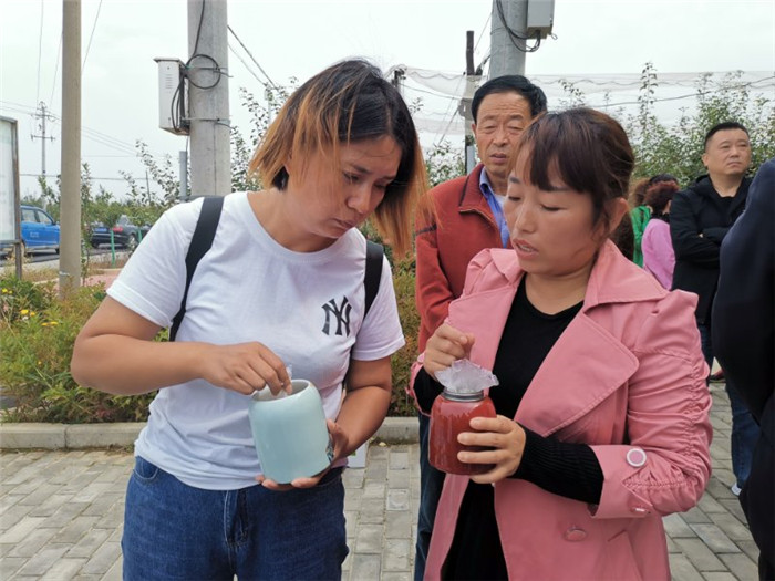 活动当天,田庄镇展出了苹果、翡翠梨、金银花等四大类20多种农特产品,向前来考察踩点的旅行社代表进行品尝推荐。