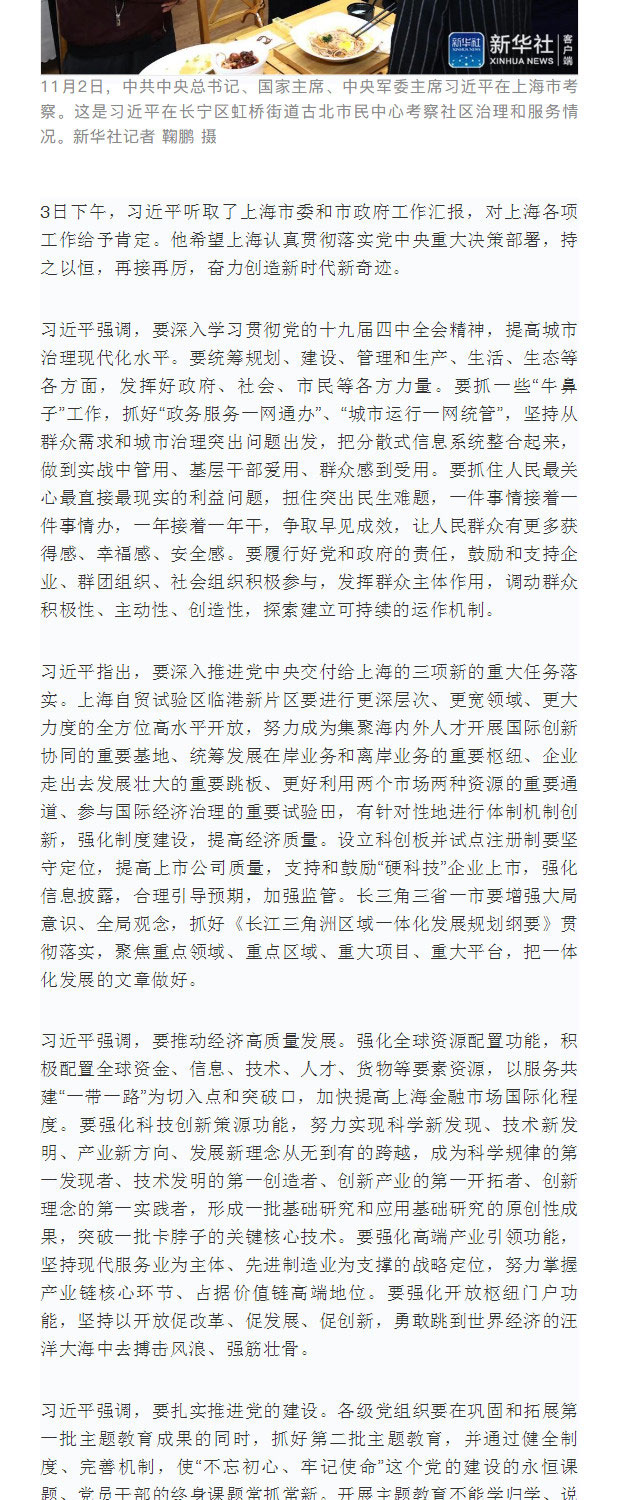 习近平:深入学习贯彻党的十九届四中全会精神 提高社会主义现代化国际大都市治理能力和水平