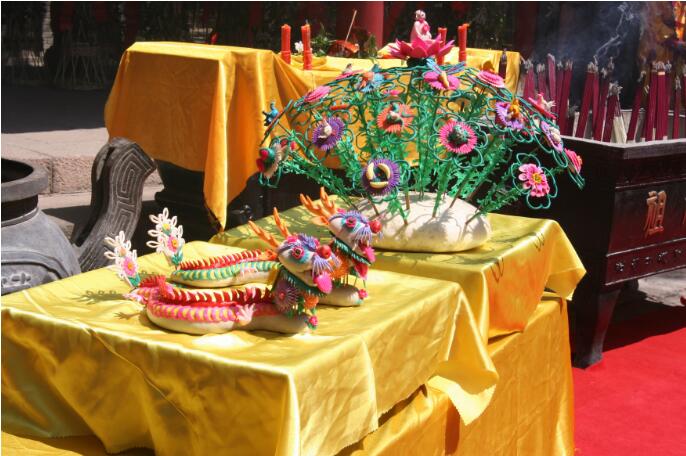 黄陵面花自古以来就与黄帝的祭典紧紧融为一体,不可分割。传说神农氏尝百草、识五谷(据《黄帝内经》记载五谷为“粳米、小豆、麦、大豆、黄黍”),自此,先民们便告别了茹毛饮血的蛮荒时代,进入了农耕的文明时代。“黄帝崩、葬桥山”(据司马迁《史记》),当时人们为了缅怀黄帝功德,祈求风调雨顺,在祭祀黄帝的过程中,以太牢(指三牲:豕、羊、牛)、时令水果、鲜花、五谷而供奉于灵位之前,行三拜九叩之礼,至虔至诚,后来随着生产力的发展和社会文明程度的日益提高,从而用面粉做出各色动物、花卉来替代三牲、花卉,用面花祭品祭祀祖先这一形式经过漫长的发展演变,逐渐由官方向民间转化,同时也紧紧地与当地的生产生活、岁时节令、婚丧嫁取、生儿育女等结合起来,更加增加了面花在民间的普及性和平民化特征,时代发展到今天,面花在当地群众的日常生活中也随处可见,成为祭祀活动中和日常生活中不可或缺的重要组成部分。