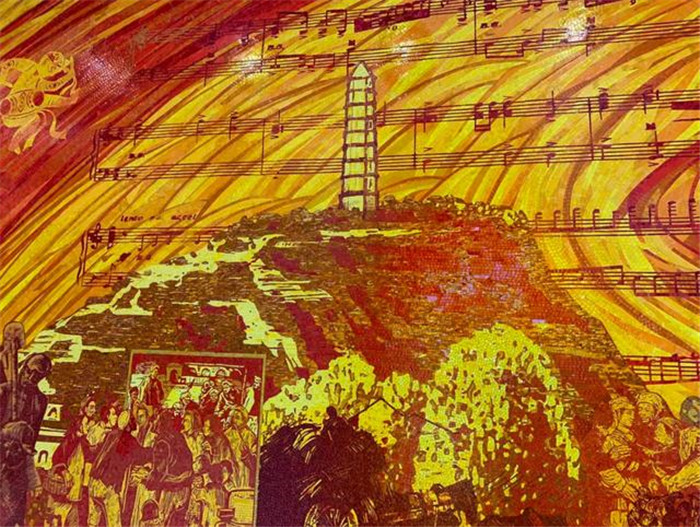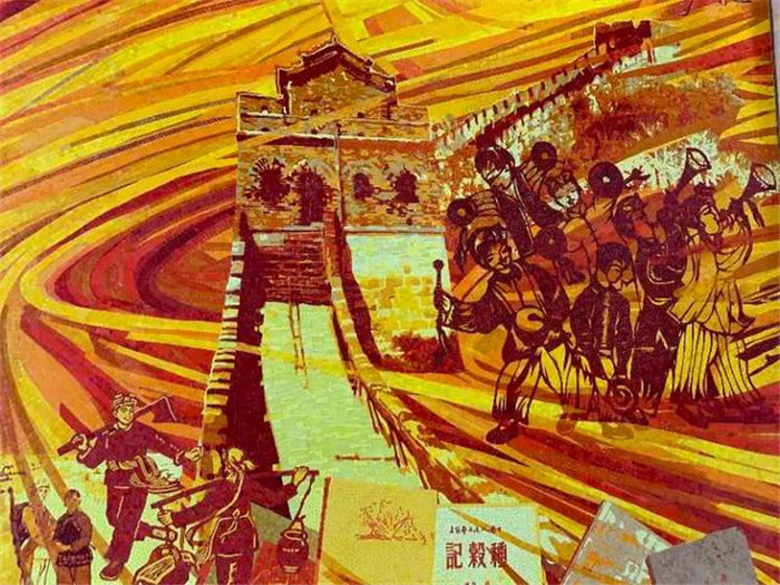 大型壁画《延安文艺 永恒华章》局部 范迪安 白晓刚 在四重叠印的视觉图像中,《延安文艺 永恒华章》以奔腾的黄河和红色的飘带组合的意象通贯全画,以桔红、金黄为主调,表现黄土高原的地域色感,表征延安文艺的光辉成就;同时以中国画的长卷格式展现了延安文艺的历史渊源和丰硕成果,形成强烈的视觉旋律,构成了宽阔的历史时空,如同一首视觉交响诗:画面从左到右分为三个段落,分别描绘以黄帝陵、轩辕像为代表的历史文化,以鲁艺为代表的革命文艺创作成果,和以日出东方和雄伟长城象征延安文艺精神的传承发展。